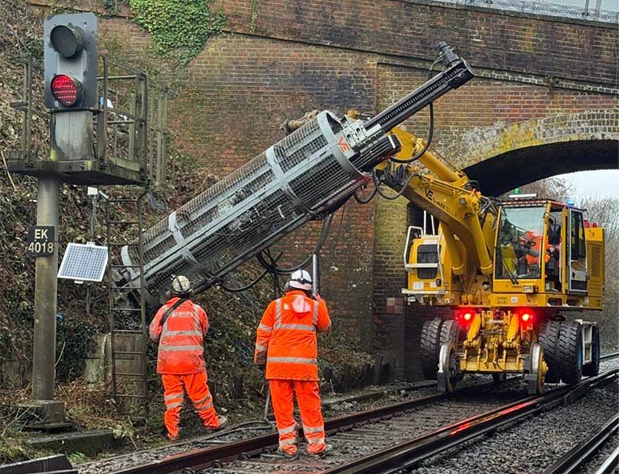 • We are working on two rock cuttings either side of Maidstone East station. At Maidstone East Grammar School rock cutting and embankment, the London side of Maidstone, we will renew more than 1,300 yards of the cutting.  This includes installing new rock netting and bolting to stabilise the slopes and reduce the risk of rockfalls. At the country end of the Wheeler Street tunnel, we are also undertaking stabilisation works of the rock cutting and embankment.