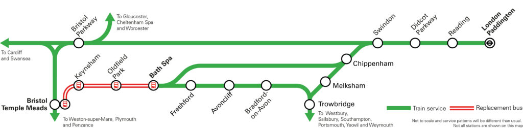 Hourly trains between London Paddington and Bristol Temple Meads will use an alternative route via Bristol Parkway – not stopping at Chippenham or Bath Spa.
